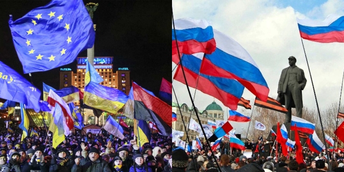 D’eascair na náisiúin oir-Shlavacha atá ann anois ón Русь (Rus), stát scaoilte a raibh a lárionad suite i gCív agus a chuimsigh treibheanna Slavacha an oirthir (féach Mapa A). Tá an fhoinse choitinn sin soiléir ó na hainmneacha a thugtaí ar na ciníocha go stairiúil: mar atá, Великорусские (‘mór-Rúisigh’), Малорусские (‘mion-Rúisigh’ nó Úcránaigh) agus Белорусские (‘fionn-Rúisigh’ nó Bealarúisigh). Cuireadh cor sa stair sa bhliain 1240 nuair a scrios na Mongólaigh cathair Chív. D’fhan an chuid ba mhó den Русская земля (críoch Rúiseach) faoi smacht na Mongólach is a gcomharbaí sa Mhathshlua Órga (an dream ónar shíolraigh Tartaraigh an lae inniu) go ceann i bhfad, ach bhí cúpla eisceacht ann: tháinig iarthar na hÚcráine agus an Bhealarúis faoi cheannas na Polainne is na Liotuáine faoi seach, agus d’éirigh le roinnt cathracha a bhí suite i bhfad ó thuaidh fanúint neamhspleách (Mapa B). Bhris concas na Mongólach na naisc pholaitiúla idir ciníocha Slavacha an oirthir agus is ón 13ú céad nó ón 14ú céad amach a thosaigh na canúintí ag scarúint óna chéile. Cuireadh deighilt reiligiúnach leis na cinn eile sa bhliain 1596 nuair a thoiligh an chuid ba mhó de na heaspaig Ortadocsacha sa limistéar a bhí faoi smacht na Polainne údarás an phápa sa Róimh a aithint, cé gur choinníodar a liotúirge Slavóinise féin. Má ghlac pobal na Gailíse leis an Eaglais Chaitliceach ‘Ghréagach’ seo, chuir an t-athrú creidimh seo olc as cuimse ar Úcránaigh Ortadocsacha níos faide soir agus d’éirigh siad amach i gcoinne na Polainne sa bhliain 1648. Bunaíodh stát beag Úcráineach timpeall ar chathair Chív, cé go raibh Polannaigh Chaitliceacha ag bagairt air ón iarthar agus Turcaigh Mhoslamacha ag bagairt air ón deisceart. Ach suite lastoir den Úcráin bhí impireacht Ortadocsach na Rúise agus tógadh an stát beag faoi sciath царь всея Руси ('impire na Rúise uile') nuair a síníodh Conradh Pereiaslav sa bhliain 1654 (Mapa D). As sin amach, lean na Rúisigh orthu ag gluaiseacht ó dheas i dtreo na Mara Duibhe, glúin i ndiaidh glúine, agus de réir mar a baineadh réigiúin nua i ndeisceart na hÚcráine den Tuirc, bhog lonnaitheoirí Slavacha isteach sa Новороссия (‘Rúis Nua’) a bhí á cruthú (Mapa E). D’fhás comhphobail mheasctha a raibh idir Úcránaigh agus Rúisigh iontu sna críocha a gabhadh. Má thuigtear an stair seo, tuigfear cén fáth go bhfuil an Úcráin ina ‘heterogeneous, divided country’, mar adúirt an té adúirt. De réir dhaonáireamh na bliana 2001, d’áirigh 77.8 % den phobal iad féin mar Úcráinigh agus 17.3 % mar Rúisigh. Léirigh an daonáireamh céanna go raibh an Úcrainis mar chéad teanga ag 67.5 % den phobal agus an Rúisís ag 29.6 %. Sa Chrimé, áfach, ba Rúisigh iad 60 % den phobal: níor áirigh ach 24 % de mhuintir na Crimé iad féin mar Úcráinigh agus ba Thartaraigh iad 10 % eile.